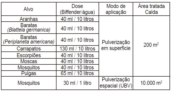 BIFFENDER® deve ser aplicado de forma uniforme, por meio de pulverização manual ou motorizada, sobre as superfícies a serem tratadas, como fendas, frestas, paredes, assoalhos, rodapés, entulhos, ralos, recantos, tetos, móveis, balcões, batentes de portas e janelas, entre outros locais que sirvam de passagem ou abrigo para os insetos. Para o controle de mosquitos, pode ser utilizado em aplicação espacial, por meio de pulverização em ultrabaixo volume (UBV).